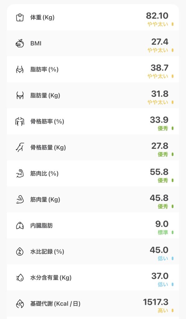 | 体脂肪率 | 39.2% | 38.7% | -0.5% |