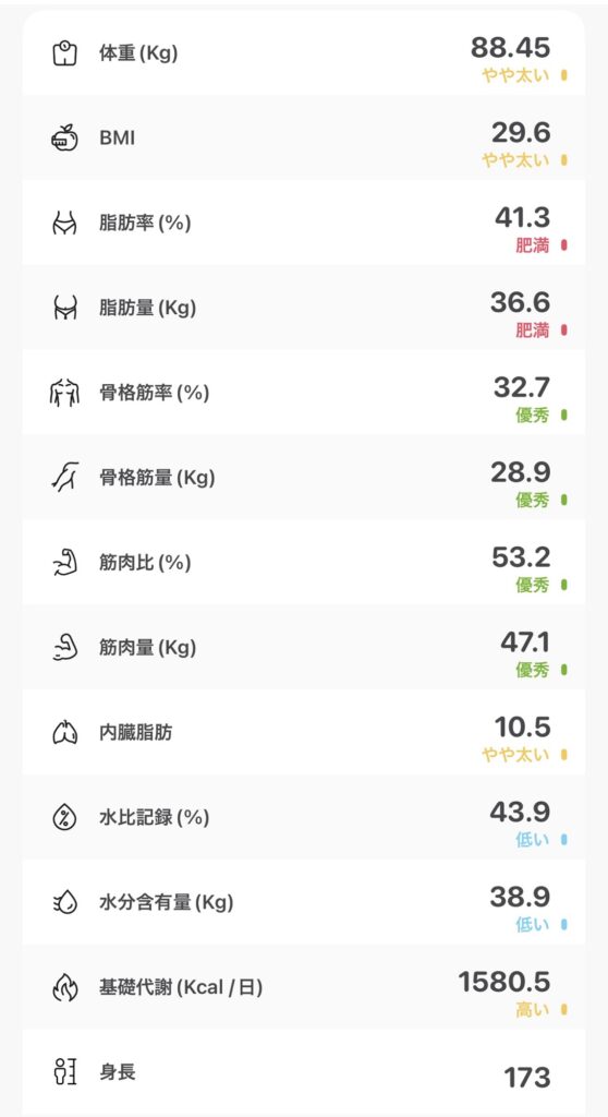 体重:88.45kg 体脂肪率:41.3%
