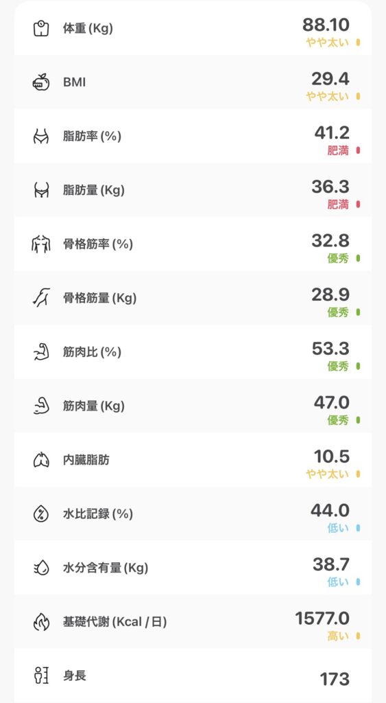 100kgからのズボラなアラフォーダイエット記録|2025年9月11日 投稿日: 2025年9月11日2025年10月9日 投稿者: こはる 100kgからのズボラなアラフォーダイエット記録|2025年9月11日 【2025年9月11日】体重・体脂肪率記録 体重:88.10kg 体脂肪率:41.2% 昨日の運動記録 なし 昨日の食事記録 朝:ご飯、卵2個 昼:ご飯、チャプチェ 夜:ご飯、納豆、魚、サラダ 今日の気づき 結局、昨日も残業と偏頭痛で運動出来ませんでした…トラブル対応なので仕方ないにしても、夜遅くまでの残業が続くと、やはりモチベーションが落ちます。 ですが、おかげで腰の痛みもほぼ治まり、今日から運動を再開出来ました!また明日の日記で報告します。