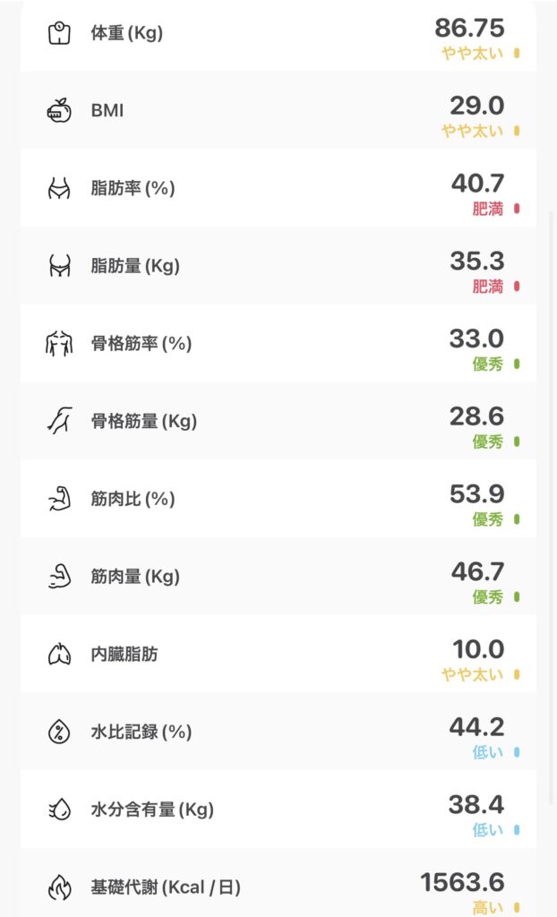 体重:86.75kg 体脂肪率:40.7%