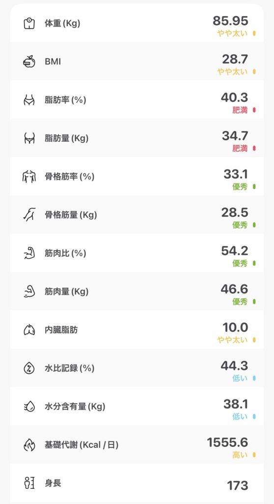 生理中の水分貯留がある中でも、体重が過去最小値を記録しました。素直に嬉しい気持ちでいっぱいです。明日にはさらに良い結果が出るといいなと期待しています。